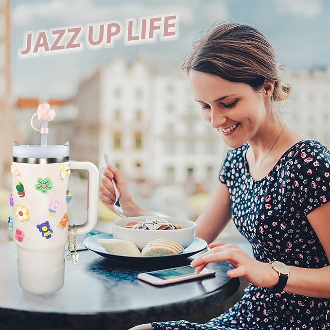 - Package Includes - The stanley cup accessories set includes 1 pcs cloud straw cap and 1 pcs heart-shaped straw cover, 15 Pcs 3D stickers, 1 pcs letter A charm and 1 pcs flower charm, 1pcs bling silicone boot sleeve, specially designed for Stanley Adventure Quencher 40oz and Stanley IceFlow 20oz 30oz tumblers water bottles. Straw covers match for 9-10mm straws.