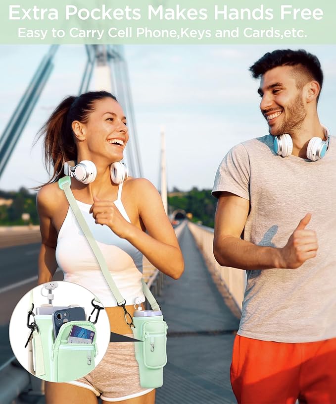 - 【Adjustable Shoulder Strap and Multiple Pockets】For Stanley Quencher 40 oz Cup Sleeve comes with a removable and adjustable padded shoulder strap, the shoulder strap can be easily adjusted between 27.5" and 50" to fit a wide range of body shapes. The water bottle holder for stanley accessories 40 oz tumbler is designed with two front pocket designs that provide plenty of room for all your personal belongings such as smartphones, cash, cards,keys,etc