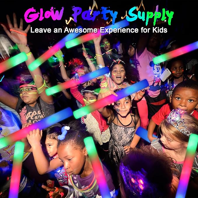 - Glow in the Dark Party Supply - Ideal for a wide range of events, including birthday parties, wedding receptions, concerts, bars, sporting events, rave parties, community activities, camping trips, halloween party, and classroom giveaways. These foam glow sticks are perfect for both indoor and outdoor use, even glow party.
