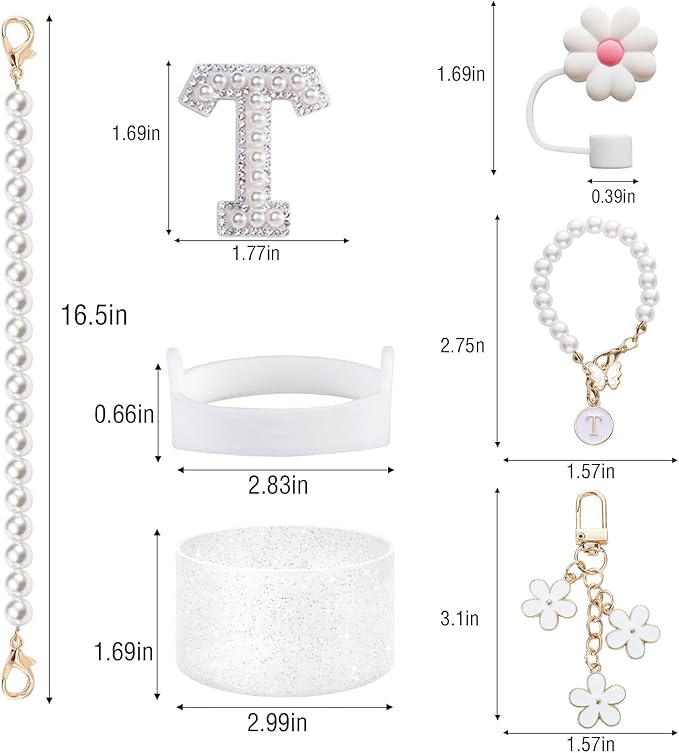 - đăPackage Includedă1pcs water bottle handle pearl strap, 1pcs pearl letter Charms, 1pcs pearl initial sticker, 1pcs bling bottle boot, 1pcs silicone straw cover, 1pcs daisy key-chain, not include cup