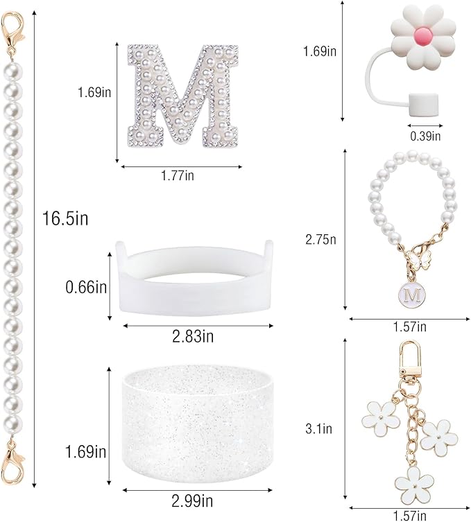 - đăPackage Includedă1pcs water bottle handle pearl strap, 1pcs pearl letter Charms, 1pcs pearl initial sticker, 1pcs bling bottle boot, 1pcs silicone straw cover, 1pcs daisy key-chain, not include cup