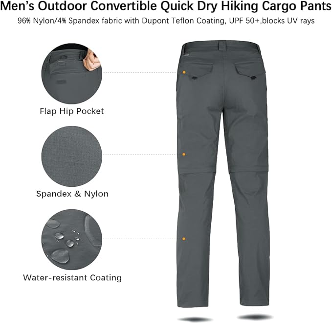 - ADVANCED TECHNOLOGY: DuPont Teflon Coating with durable water repellent can effectively repels liquids and stains, always keep the waterproof pants mens dry and clean. This quick dry pants for men features UPF 50+, which can blocks UVA and UVB rays to protect your skin from damage