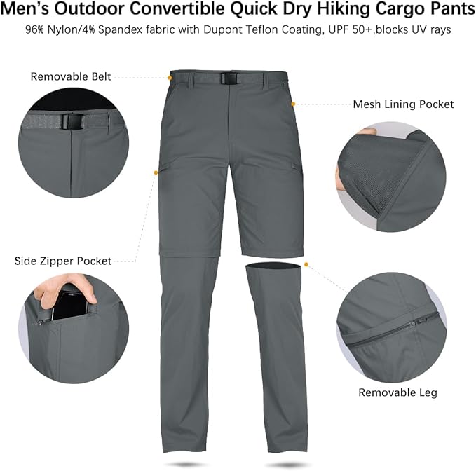 FREE SOLDIER Men's Outdoor Convertible Hiking Pants with Belt Lightweight Quick Dry Tactical Cargo Pants Nylon Spandex