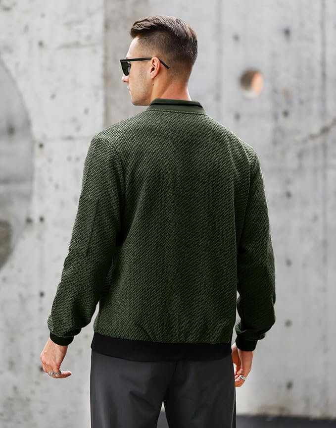 - 【STYLISH DESIGN】: Mens Casual Jacket designed with a full zip, ribbed hem and cuffs, left arm with decorative zipper and 2 side pockets on the front. Featured with V-shaped pattern solid jacquard design, selected clear textured fine fabric, giving this jacket stylish and unique sense.