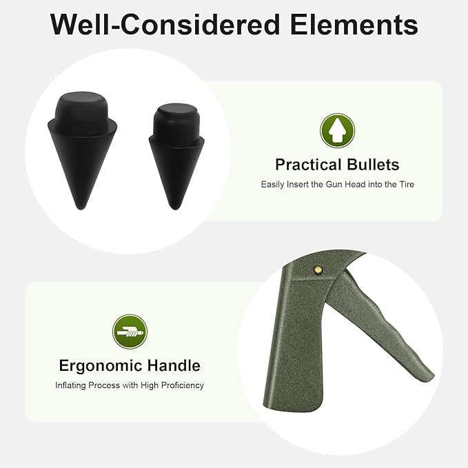 - đźš—Easy to Install: Tire does not need to be removed from the wheel; Inflator is directly accessible during puncturing; Mushroom head seat on the inside wall of the tire. The ergonomic handle and trigger fit your fingers well and are easy for you to hold