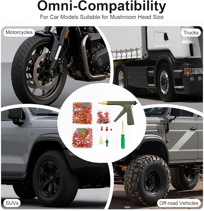 - đźš—Wide Application: This tire wheel repair gun kit is suitable for many tubeless cars, motorcycles, electric vehicles, scooters, lawnmowers, trucks, off-road vehicles, SUVs, etc., and can be widely used in homes, car repair shops, car maintenance shops, etc