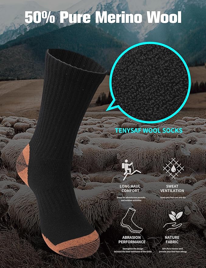 - Premium Material: 46% Premium Merino Wool, 28% Lyocell, 10% polyester, 10% Nylon, and 6% spandex. Merino Wool is more breathable and warmer than other ordinary fibers. Nylon and Acrylic have features of anti-pilling and reducing wear and tear, and stretchable elastic that keeps your socks from loosening and letting cold air in. The perfect material ratio makes the men's wool socks more comfortable, durable, and warm.