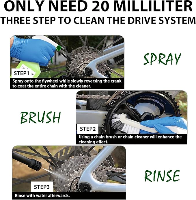 - [Fits All Bikes]: Only need 20 milliliter, this bike chain degreaser will keep your standard bike, mountain bike or e-bike clean.
