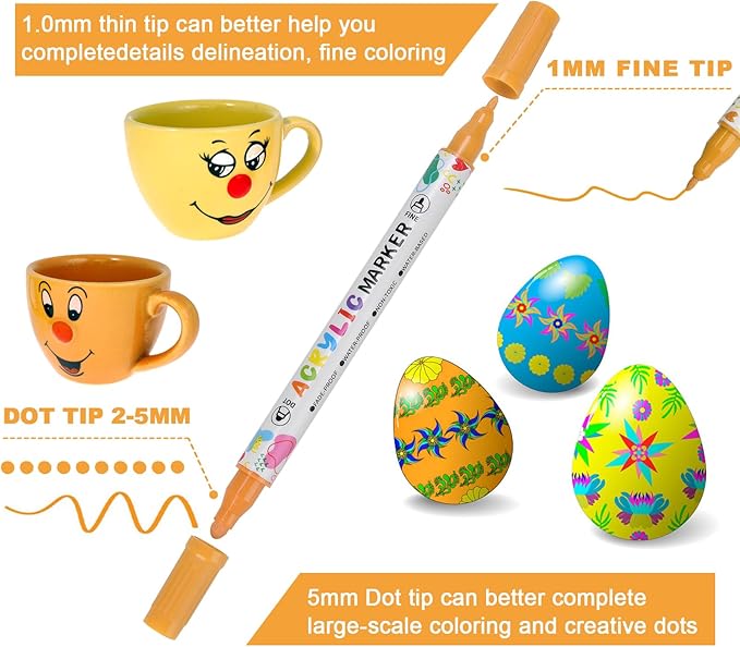 - Multi purpose Dual Tip Acrylic Paint Pens with Fine and Dot Tips ---- Each KEMYR pen is equipped with a 1-5 mm dot tip for filling large areas and bold points, and a 1 mm fine tip for lines and details work.