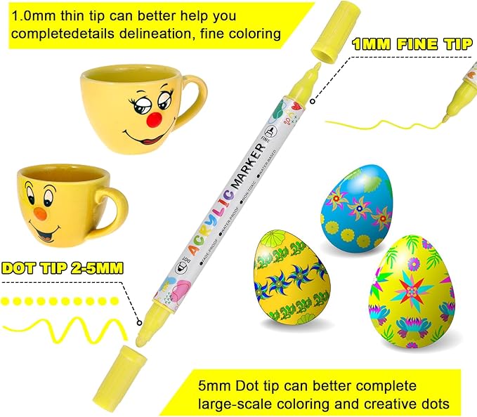 - Multi purpose Dual Tip Acrylic Paint Pens with Fine and Dot Tips ---- Each KEMYR pen is equipped with a 1-5 mm dot tip for filling large areas and bold points, and a 1 mm fine tip for lines and details work.