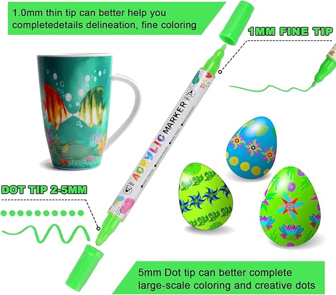 - Multi purpose Dual Tip Acrylic Paint Pens with Fine and Dot Tips ---- Each KEMYR pen is equipped with a 1-5 mm dot tip for filling large areas and bold points, and a 1 mm fine tip for lines and details work.