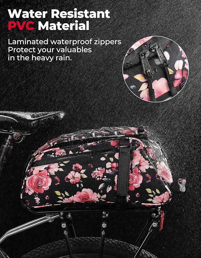 - Three-in-One Functional Portable Design: The bike rear rack bag comes with a hand strap and adjustable shoulder straps, allowing you to carry it by hand, over one shoulder, or as a backpack. This makes it easy to carry when not riding. The bicycle bag is designed to be fashionable and simple, aligning more with current trends