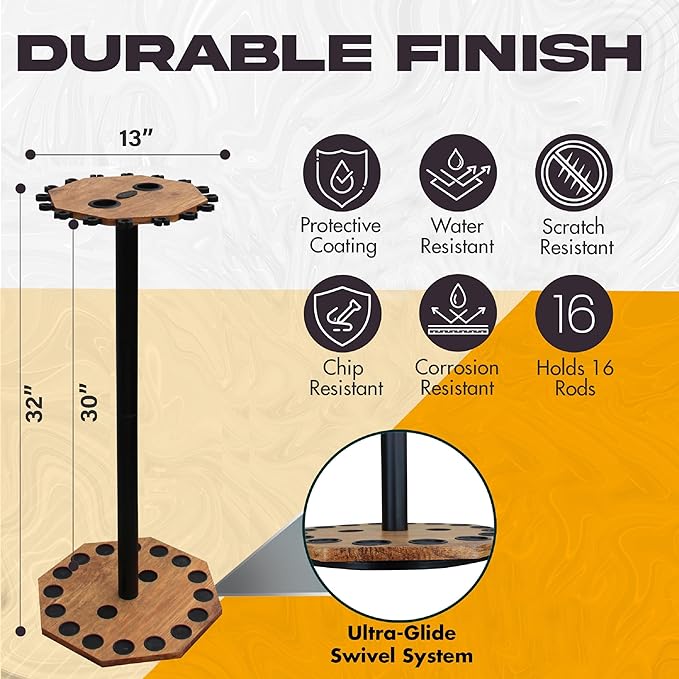 - HIGH-QUALITY WOOD CONSTRUCTION: Featuring a meticulously made solid wood center post and wood grain laminate, this 16-rod fishing pole organizer is extra sturdy and reliable, providing long-term storage for your fishing gear