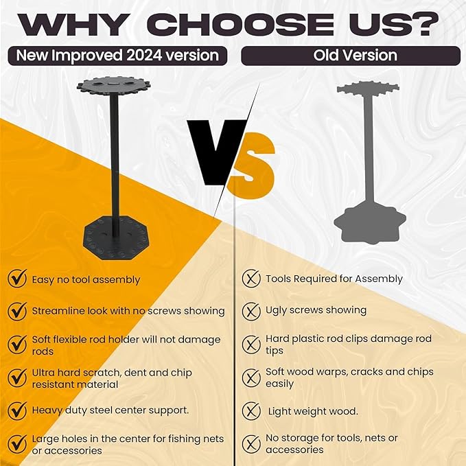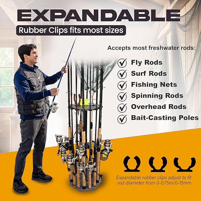 - SPACE-SAVING, 360° ACCESS DESIGN: Fishing rod organizer is 13.5" in diameter, sturdy, and lightweight, making maneuvering easier even with all your fishing gear; its vertical design reduces clutter and frees up floor space