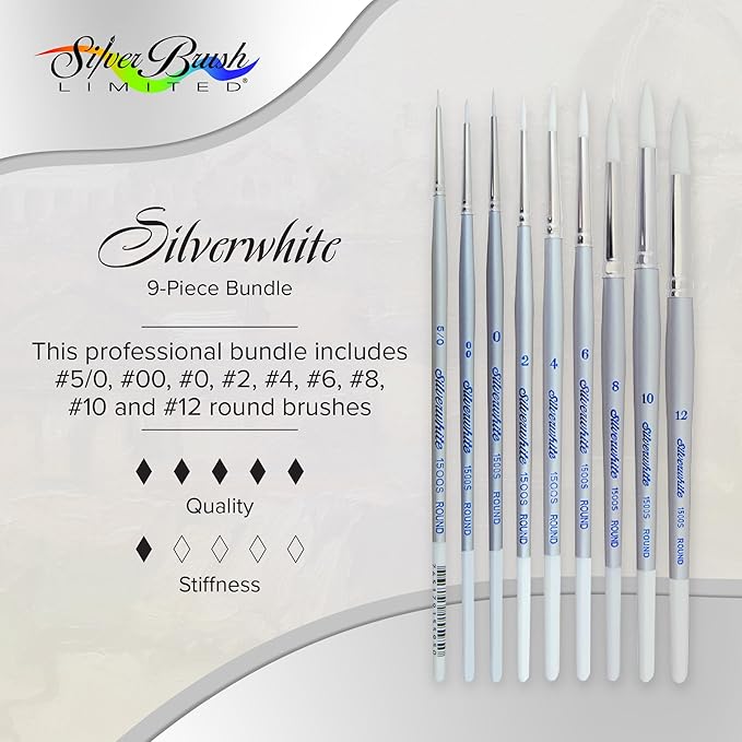 Silver Brush Limited SW-1584S Silverwhite Short Handle Round Brushes with Soft Synthetic Taklon, 9pc Premium Artist Painting Bundle for Acrylics, Watercolor, Gauche, Ink, Dye, Craft Paint, & Tempera