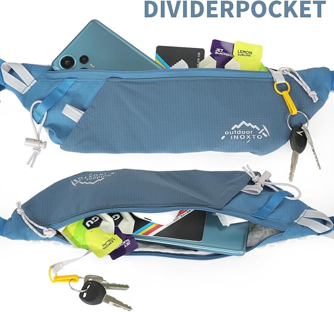 - ❤【Large Main Compartment Capacity】The Inoxto Running Belt Fanny Pack is a lightweight running waist pack that weighs only 200 grams. Its main compartment is designed to be spacious and can store mobile phones, tissues, keys, cash, cards, sports products, etc. This product is suitable for most smartphones with screen sizes below 6.6 inches, ensuring that users can conveniently carry essential items during exercise and enhance their exercise experience. Its lightweight nature makes running, fitness and other activities more comfortable without causing any burden.