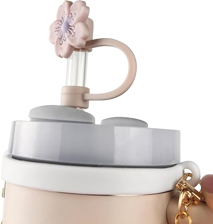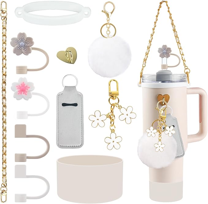 - 【Package Inside 】1 pcs water bottle handle strap, 1 pcs drawstring ring for the tumbler, 4 pcs silicone straw covers, 1 pcs flower keychain, 1 pcs pompom ball, 1pcs heart hook, 1 pcs silicone cup boot, 1 pcs lip balm sleeve