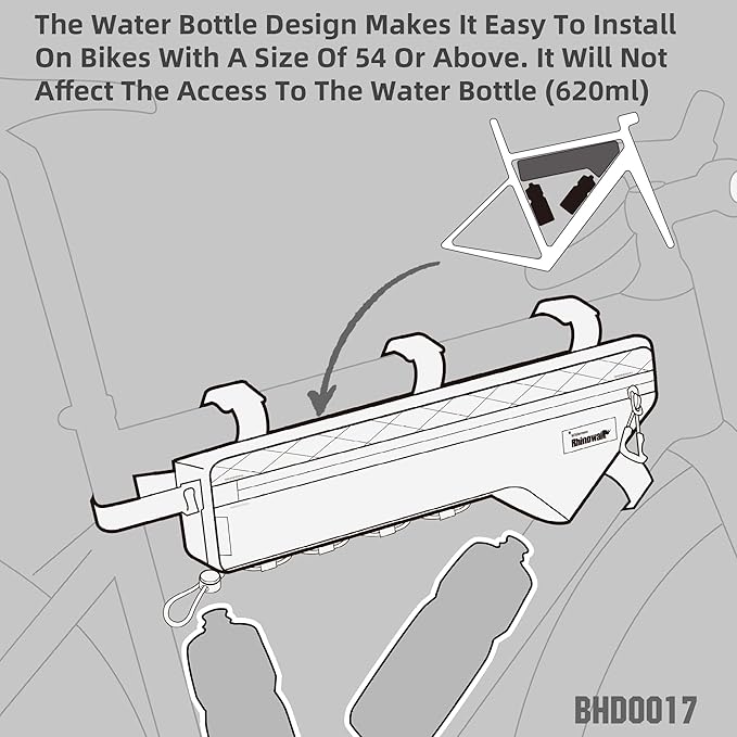 - WATER BOTTLE HIDING DESIGN: Installing it on a frame larger than 54 yards will hardly affect the access to the water bottle (620ML). Noted: If you need to install the frame bag and two water bottles at the same time, the best choice is to use a road bike frame of size 54 (M) or above, because each brand's road model and frame geometry may be different (this frame bag is not suitable for most mountain bike frames).