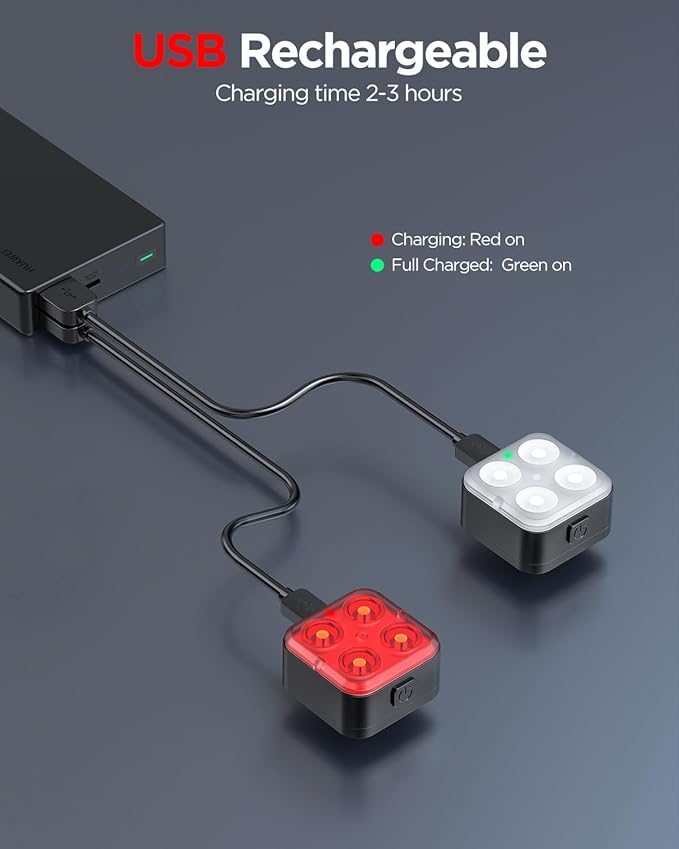 - USB CHARGING & Waterproof; Front light and tail light aii support USB charging, Fully charged in just 2.5 hours. Water resistant rated to IPX4 - Protected against splashing water from any angle.