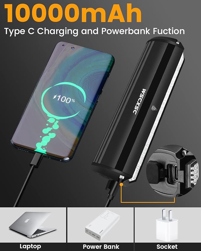 - Long Runtime&As a power bank: This rechargeable bicycle light features an impressive 10000mAh large battery capacity, providing a runtime of 2.5 to 7.5 hours, making it ideal for long rides! Additionally, it has a power bank function that allows you to charge your phone in an emergency, ensuring you stay connected while biking outdoors! This is very important when you are cycling outdoors