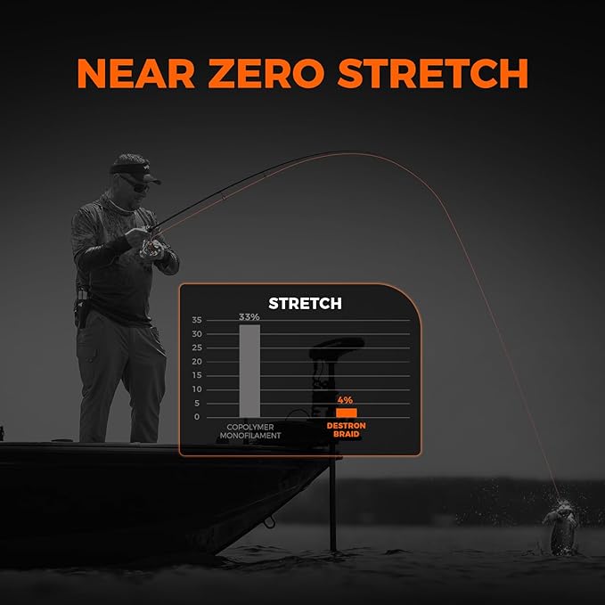 - Ultra-thin Diameter/Zero Stretch – The ultra-thin diameter means you can use a thinner line without giving up strength or line capacity. The diameter-to-strength ratio is 75% thinner than most monofilament fishing lines so you get more power with thinner diameters which means more line capacity. Zero stretch and no memory make Destron braided fishing line highly sensitive to the lightest strikes. You’ll feel more bites and generate solid hook sets with Destron Braided Lines.