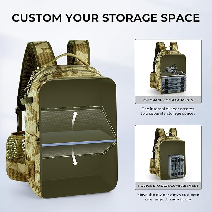 - Customizable Compartments: Stay organized with a main compartment that easily converts from one large space to two separate compartments. The lower compartment is designed to hold up to four 3600-size tackle boxes (NOT INLCUDED) with a zippered panel for quick access, giving you ultimate flexibility to organize tackle and gear for different fishing trips.