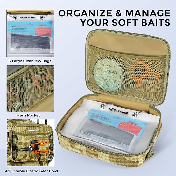 - Interchangeable Storage System: The KastKing BaitSpace 50L Backpack comes with a removable soft bait binder bag that includes six clear-view sleeves (9.5” x 7.5”) for quick identification of your baits. This versatile system allows you to swap the binder bag for an optional lunch cooler or line spooling bag (both sold separately), making it adaptable to your fishing needs and lifestyle.