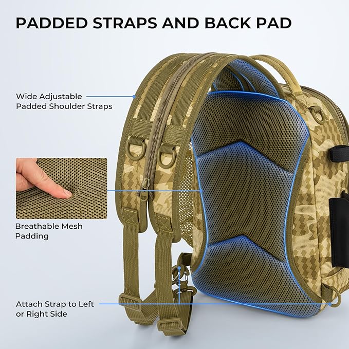 • DURABLE, WATER-RESISTANT CONSTRUCTION – Made with tear-resistant nylon oxford and a 4-layer build, including a PVC water-resistant coating, EPE foam padding, and high-density fabric lining. This rugged fishing sling bag is built to withstand harsh outdoor conditions, ensuring long-lasting durability.