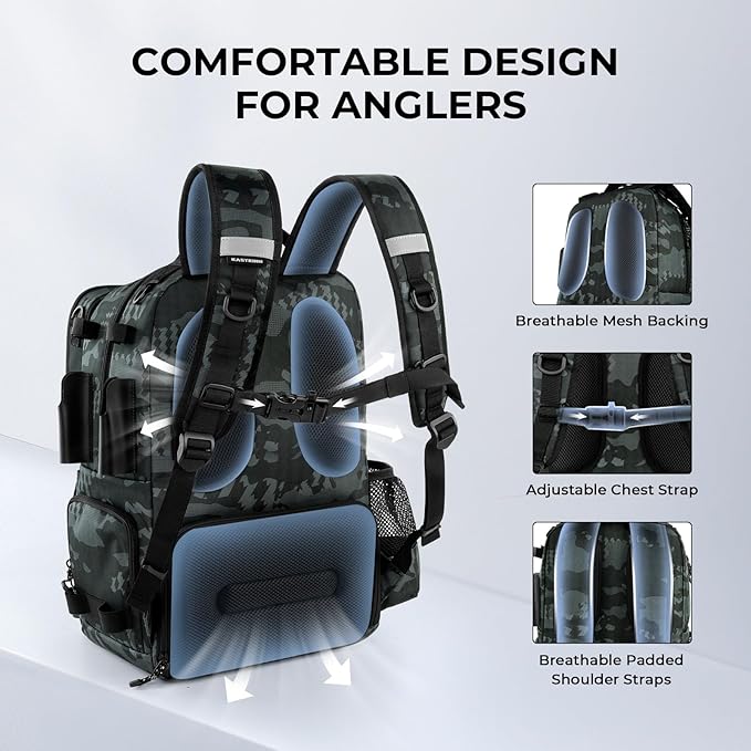 - Comfortable and Functional Design: Designed for long fishing trips, this backpack features a breathable padded back pad, ergonomic shoulder straps, and an adjustable chest strap for all-day comfort. Large loop zipper pulls make it easy to open all pockets and access your fishing gear quickly, while multiple D-rings provide convenient attachment points for lanyards, tools, or other essential equipment.
