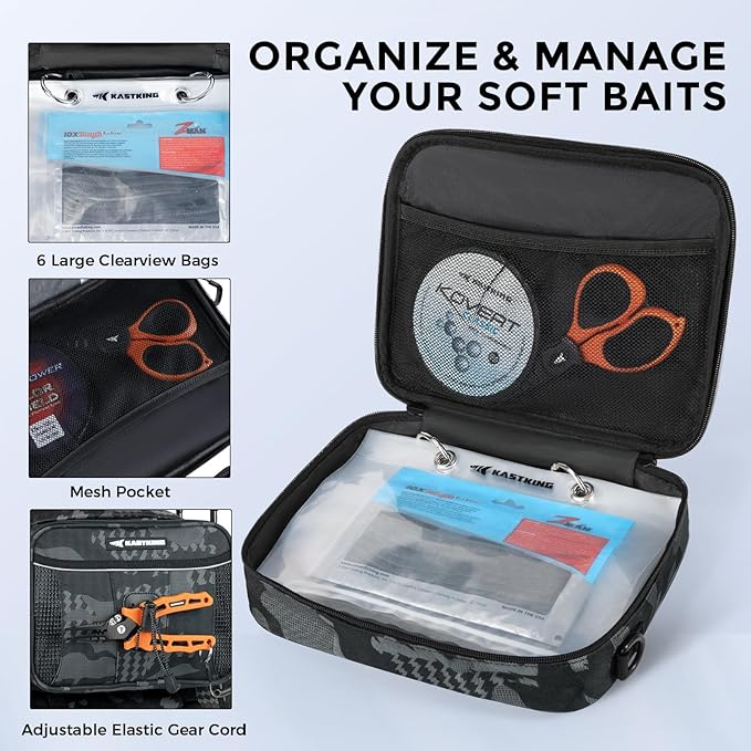 - Interchangeable Storage System: The KastKing BaitSpace 50L Backpack comes with a removable soft bait binder bag that includes six clear-view sleeves (9.5” x 7.5”) for quick identification of your baits. This versatile system allows you to swap the binder bag for an optional lunch cooler or line spooling bag (both sold separately), making it adaptable to your fishing needs and lifestyle.