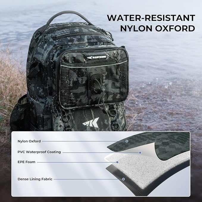 - Durable and Water-Resistant: Built for rugged fishing conditions, this backpack is made from heavy-duty rip-stop nylon and water-resistant high-density oxford fabric. The hydrophobic coating offers added protection, keeping your gear dry and safe from splashes, rain, and other outdoor elements.