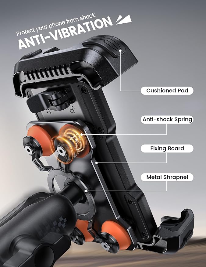 - 【Dual Anti-Shock - Patented Shock Absorber】Specially made for motorcycle! This motorcycle cell phone mount provides ultimate protection for your phone and camera. While the motorbike is running at high speed, the high frequency vibration generated by the engine can cause irreversible damage to your phone. Thanks to adopt the unique dual damping design of anti-shock spring and airbag silicone, this phone mount converts high-frequency vibrations into low-frequency vibrations to minimise damage.