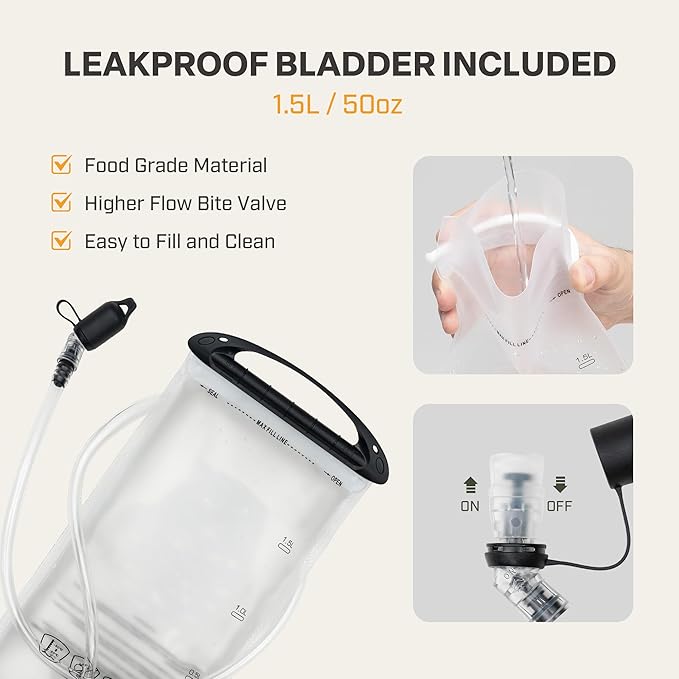 - Efficient Hydration System - The Included 1.5L leakproof hydration bladder is made from food-grade PEVA material. The 50oz reservoir offers quick water flow, provides enough water for a two hour ride. The ergonomic design, and high-flow self-sealing water delivery system make it easy to stay hydrated. The large opening of the reservoir also makes it simple to clean, designed for quicker loading and refilling.
