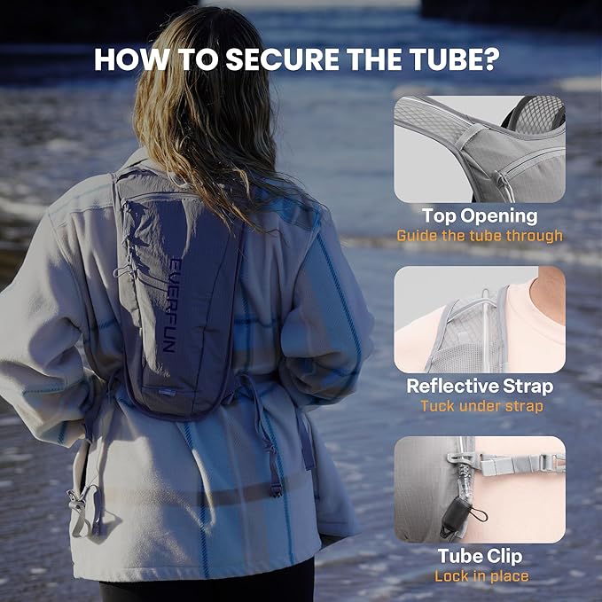 - Integrated Storage Management - The EVERFUN hiking day pack is equipped with 4 spacious pockets, this backpack allows you to conveniently store soft flasks, snacks, and other running gear, essentials. The secure zipper pocket is ideal for keeping your valuables such as keys and phones safe and easily accessible. Tube Clamp: Keeps your hose and tube secure and accessible.