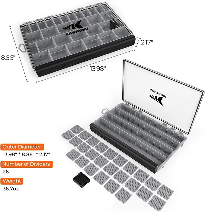 - Available in Two Sizes: The KastKing HyperSeal Waterproof Tackle Box comes in two different sizes, 3600 and 3700 boxes that fit in popular tackle bags or boat storage systems. Each provides ample space for organizing all your fishing gear, from crankbaits, jerkbaits, spinners, spoons and so much more. Also works great for hooks and terminal tackle.