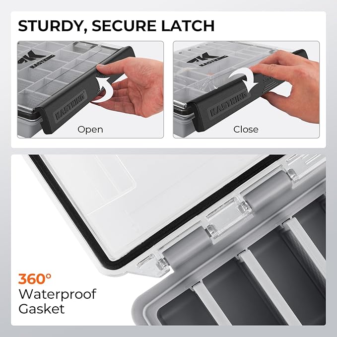- One-Hand Open and Close: KastKing’s HyperSeal One-Hand open and close latching system is fast and secure. With one simple motion, you can quickly open the full-length latching system to access your lures or terminal tackle. When finished selecting the proper bait, quickly and securely close the box with just one hand. Each box also includes an exterior label so you can organize your tackle bag or boat lockers for easy identification from above.