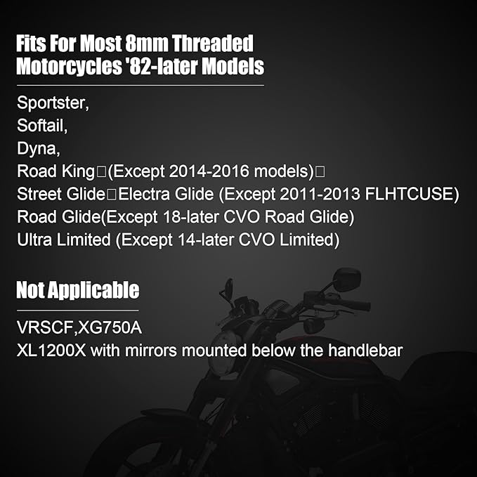 - Fitment: Motorcycle rearview mirrors black fit for most 8mm threaded motorcycles '82-later models such as Road King Street Electra Glide Dyna Softail Road Glide Dyna Softail Sportster 1200 883(except VRSCF models and XL1200X models with mirrors mounted below the handlebar)