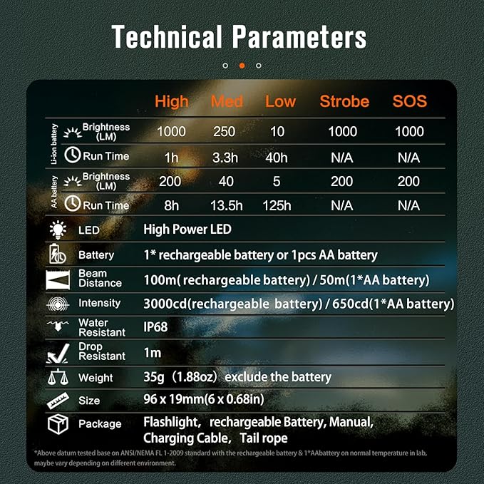 - *High Performance Flashlight:1000 high lumens. Featured with 3 light modes: High / Medium / Low ,running time up to 40 hours perfectly meet the various needs of daily use, C3 flashlight will be your perfect companion