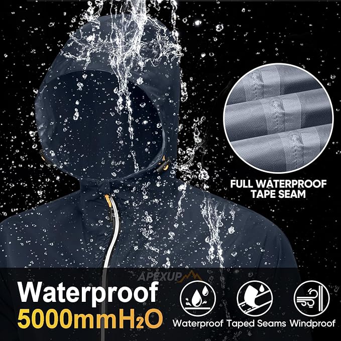 - Waterproof and Windproof: APEXUP men's rain jacket is made from tear-resistant, high-density polyester with waterproof zippers; It features a premium waterproof coating and hot-pressing sealed seams, ensuring a 5000-8000mm waterproof rating to keep you dry in any weather