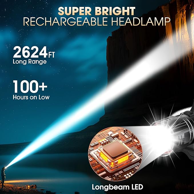 - 【90° Adjustable and Adjustable Elastic Headband】Our head lights for forehead can be adjusted up and down 90°, and each angle is firm, allowing you to choose the perfect lighting angle. The elastic headband can be easily adjusted to fit any head shape, and insulating foam is added where the headlamp fits your forehead to make it more comfortable to wear.
