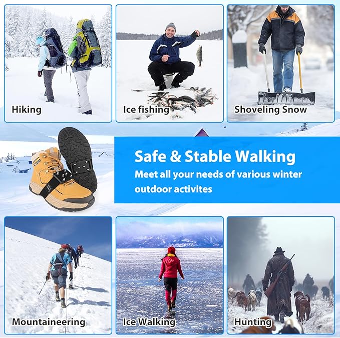 - 【Lightweight & Portable】Syourself ice grippers for shoes and boots only weighing only 6 oz. (140 g), so these snow shoe spikes can be easily folded and stored in your coat, pocket or backpack. Shoe grippers for ice and snow is designed for a variety of ice or other terrains, portable ice crampons for shoes and boots is perfect for ice fishing, walking, hiking, jogging, hunting, shoveling snow or other winter outdoor activities.