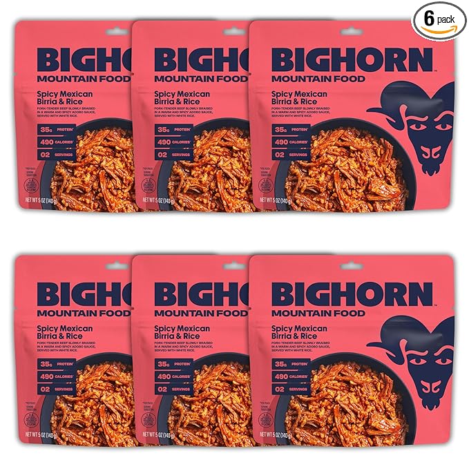BIGHORN Mountain Food Spicy Mexican Birria and Rice - contains 6 packs | 12 servings | 210g Protein | 2,940 Calories - premium freeze dried meals for backpacking food - dehydrated camping food for backpacking meal - just add water - great taste
