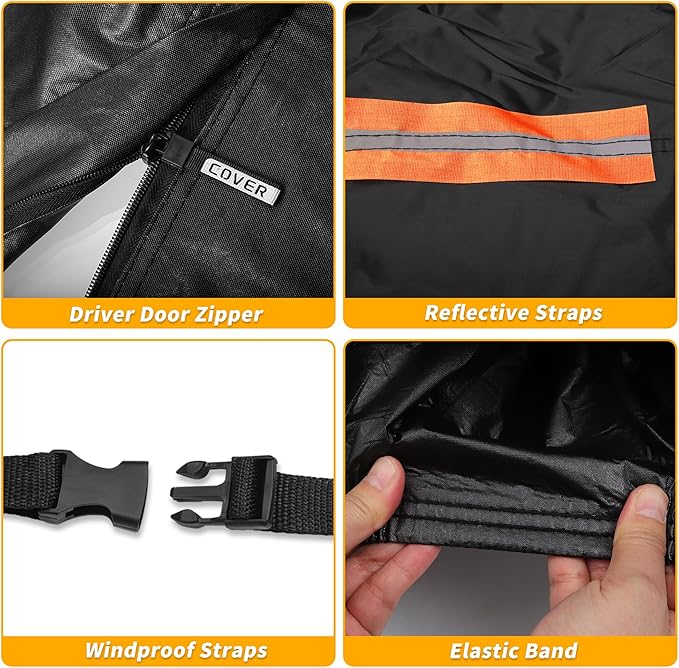 - [SIMPLY TO USE] The reflective strips in the car cover enhance nighttime visibility and parking safety. The windproof elasticized hem around the wheels is designed to firmly hold the car cover in place even on gusty days, ensuring that the vehicle remains protected from the elements Its dimensions are precisely 242 inches in length, 242 inches in width, and 74 inches in height, ensuring a comprehensive coverage for your cherished vehicle.