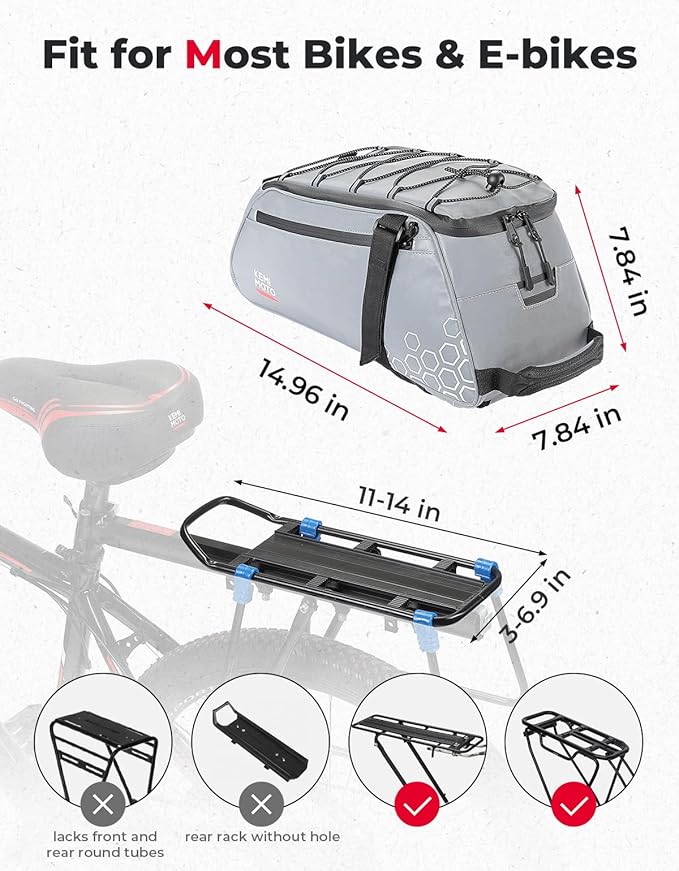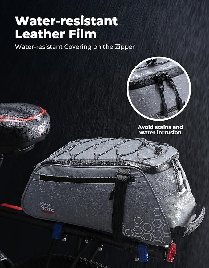- Stylish & Practical: With a polygonal pattern and unique fully reflective design, ensuring night-time safety. The rear loop for a tail light (not included) makes the KEMIMOTO Fully Reflective Bike Rear Rack Bag ideal for conquering the darkness