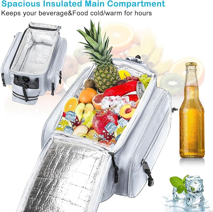 - This bike rack bag is made of waterproof polyester material. Waterproof rain cover included can fully protect the whole bike bag from rainwater, keep your belongs not be wet. Insulated inner lining can keep your drink and food cold or warm for hours. And it also can be used to store some fresh fruits, snacks or beverages.