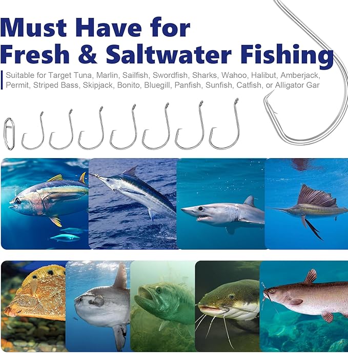 - Must Have for Fresh & Saltwater Fishing --- Our saltwater circle hooks assortment is perfect for inshore fishing hooks freshwater and saltwater. 11 mixed sizes of fish hooks is suitable for bass, walleye, trout, salmon, sunfish, channel catfish, blue catfish, and flathead catfish