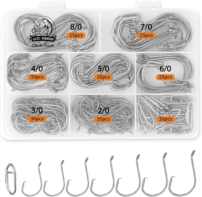 - Great Assortment --- 160pcs circle hooks & 30pcs fishing clips quick change in fishing hook set. 35pcs of each size 2/0; 30pcs of each size 3/0 & 4/0; 20pcs of each size 5/0; 15pcs of each size 6/0, 7/0 & 8/0. Circle hooks for catfish with 8 different sizes are well assorted in a reusable ultra hard plastic box