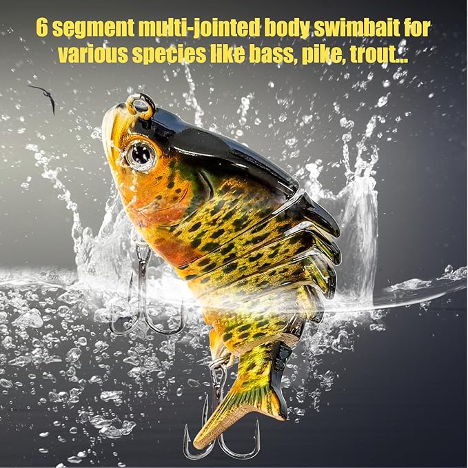 - Multi-jointed Design: Those fishing lures are divided in 6 or 8 sections so as to show an S-shape swimming posture in water, creating deadly temptation to predator fish like bass, trout, catfish, mackerel etc