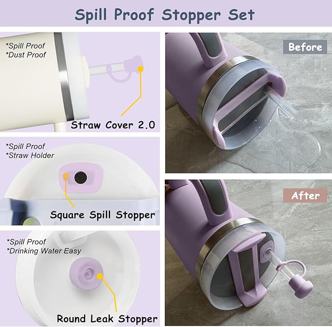 - Everything Included, Zero Hassle:This Stanley Cup Accessories Set has 7 essentials: Handle strap, silicone boot, 3 spill-proof stoppers, straw cover, elastic ring, keychain & handle charm. No more buying pieces separately!