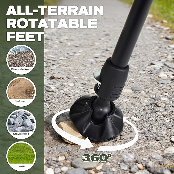 - ALL-TERRAIN ADJUSTABLE FEET: This fishing chair features rotatable feet that keep it stable on any rugged terrain. It allows you to rotate the feet on all legs, and the wider chair legs help reduce pressure and prevent the chair from sinking into soft ground. All four legs of this chair are height-adjustable (with an additional 6.3 inches of extension). Simply press the lock on the chair legs to easily extend them to your desired height.